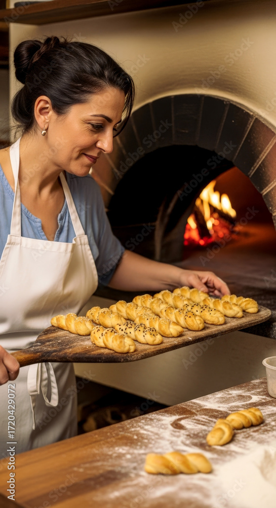 Female Greek baker sliding koulourakia cookies into an oven for holiday mornings #1720429072