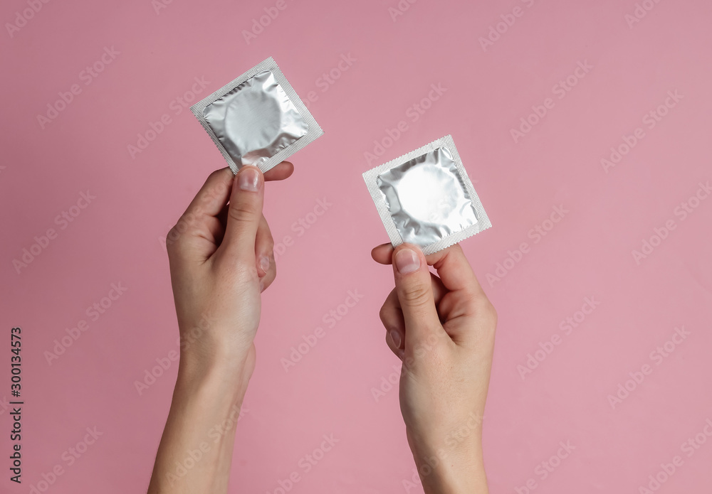 Female hands holding condom on pink background. Top view. The concept of sexual preservation #300134573