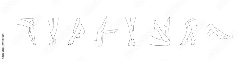 Female legs collection. Hand drawn linear woman feet in different poses. Vector Illustration of elegant icons in a trendy minimalist style. #444187664