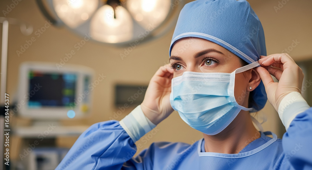 Female surgeon putting on surgical mask in operating room #1689445377