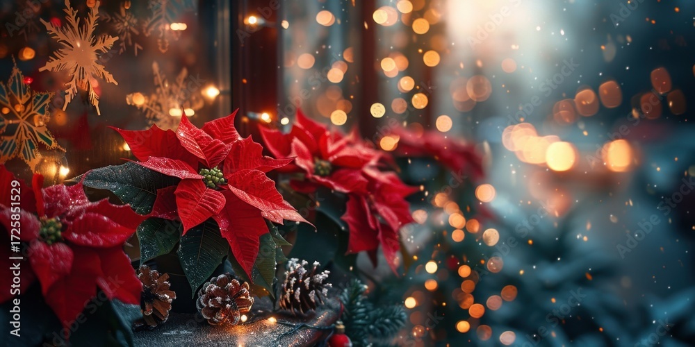 Festive holiday scene with poinsettias and glowing christmas lights #1725851529