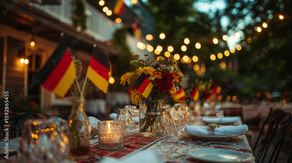 Festive outdoor dinner with german flags and warm lighting ambiance #1592865455
