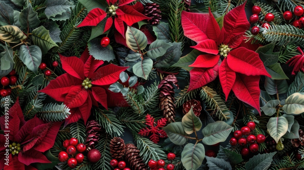 Festive poinsettia arrangement with evergreens and berries #998979310