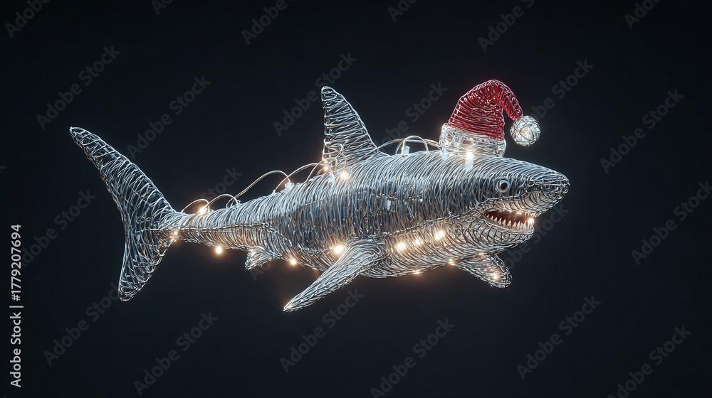 Festive shark wearing a Santa hat and Christmas lights, a whimsical and unique holiday image #1779207694