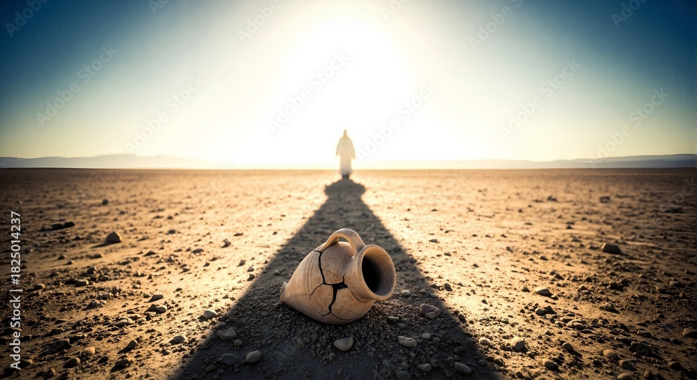 Figure of Jesus walking in desert during sunrise. Spiritual journey of faith and hope. Broken clay jug in long shadow #1825014237