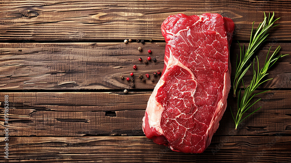 Filete de carne cruda con romero y granos de pimienta sobre mesa rústica#877852818