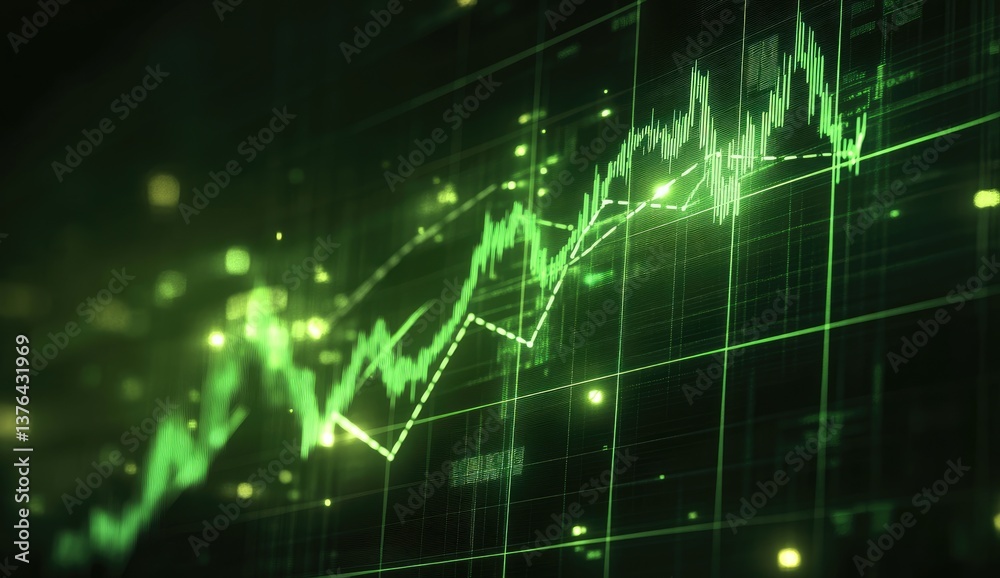 Financial data chart showing upward trend. Dynamic, glowing green graph on a dark screen #1376431969