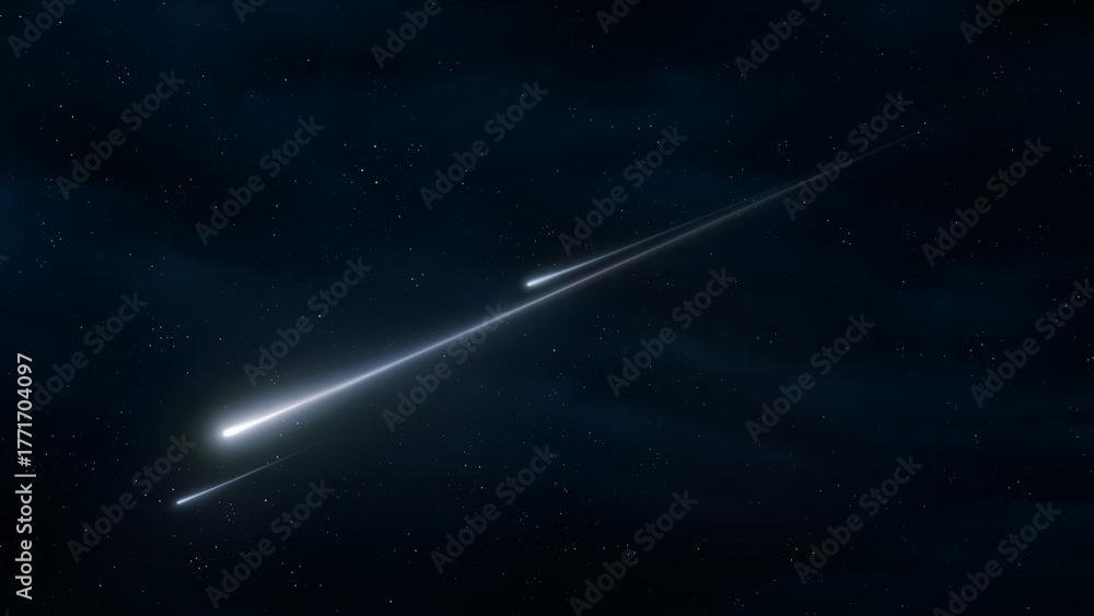 Fireballs shine brightly in the night sky. Shooting stars on a dark background. Meteor trails in the atmosphere. #1771704097