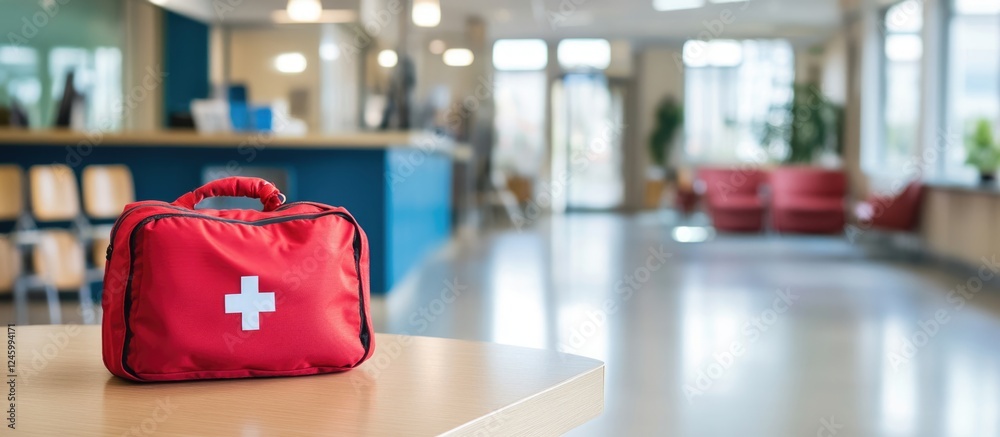 First aid kit on clinic reception desk with blurred background and copyspace for text on healthcare and emergency preparedness themes #1245994171