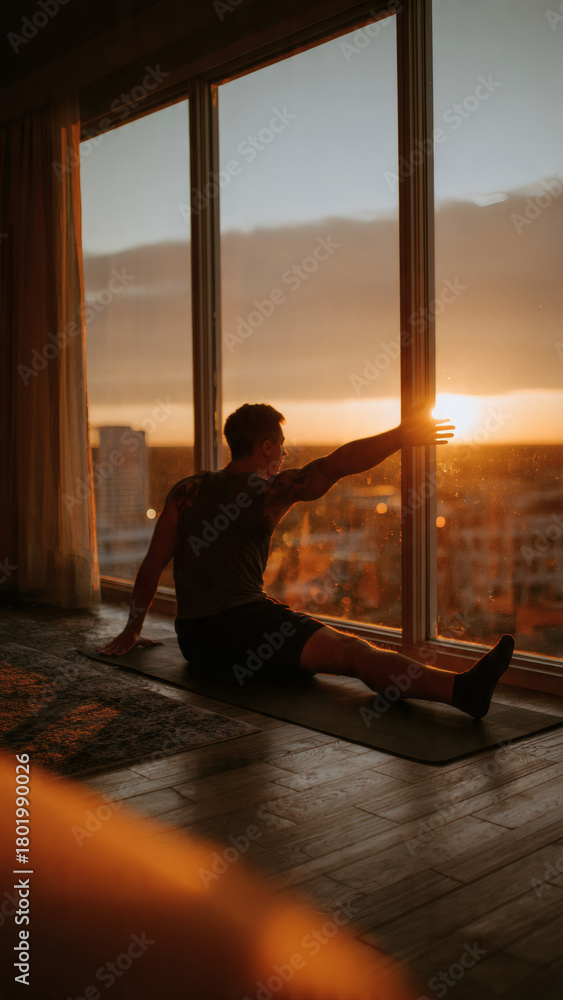 Fitness influencer stretching on yoga mat at dawn #1801990026