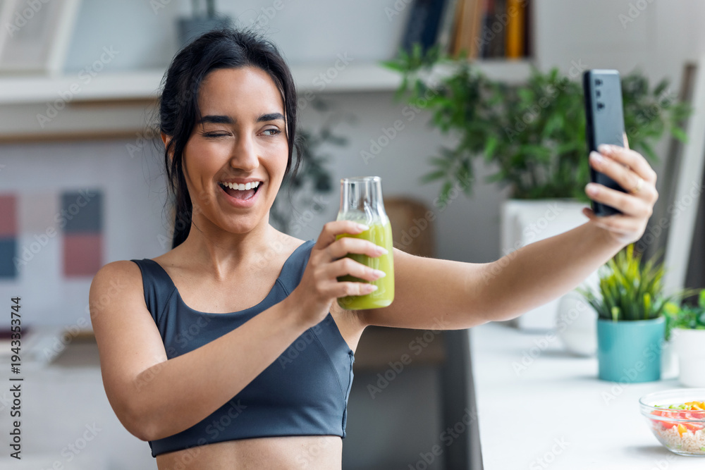 Fitness woman drinking a healthy green juice while taking a selfie with smartphone in the kitchen at home #1943353744