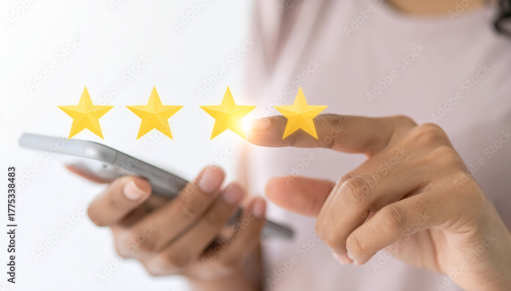 Five star rating mobile app user feedback customer review finger touch glowing stars smartphone satisfaction service quality #1775338483