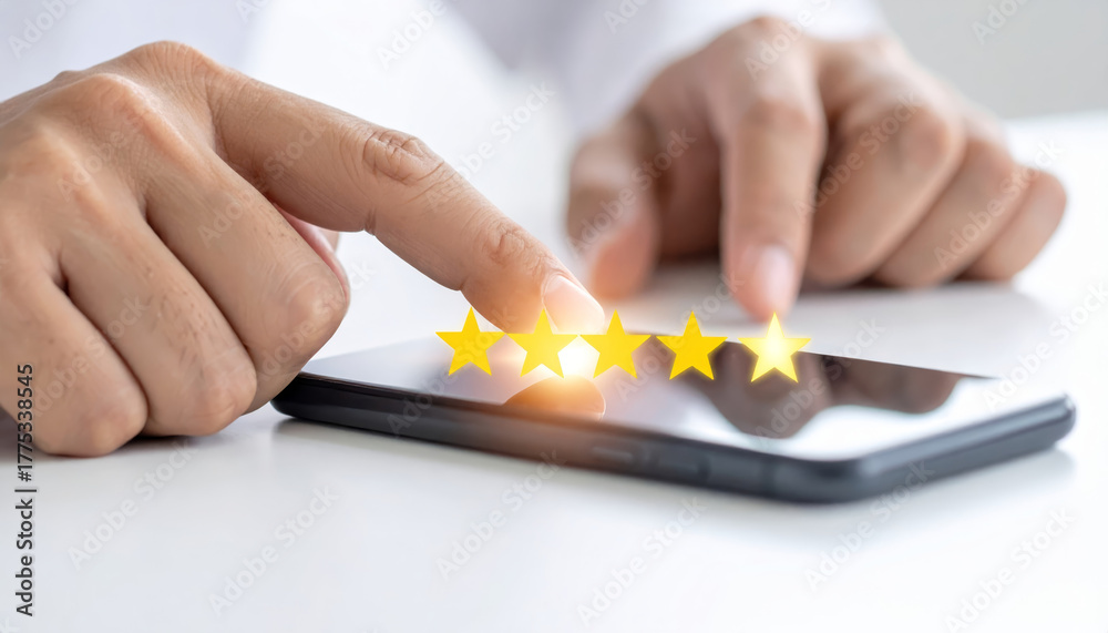 Five star rating mobile app user review customer feedback finger touch glowing stars smartphone screen satisfaction service quality positive rating with delighted mood #1775338545