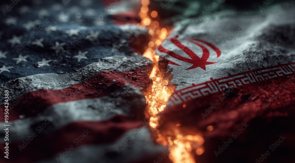 Flags of USA and Iran painted on background. United States of America versus Iran trade war disputes concept #1950424388