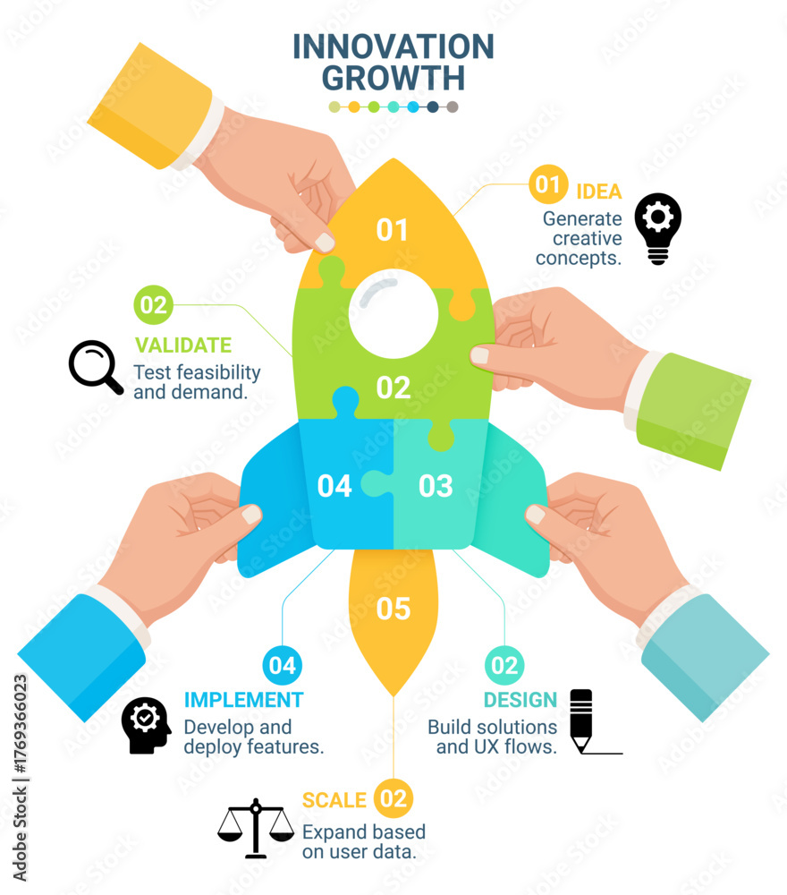 Flat design business infographic showing innovation growth strategy colorful puzzle pieces forming a rocket and hands assembling it. #1769366023