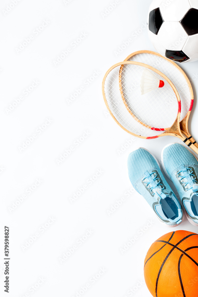 Flat lay of sport balls and rackets on white background. Above view, copy space #379598827