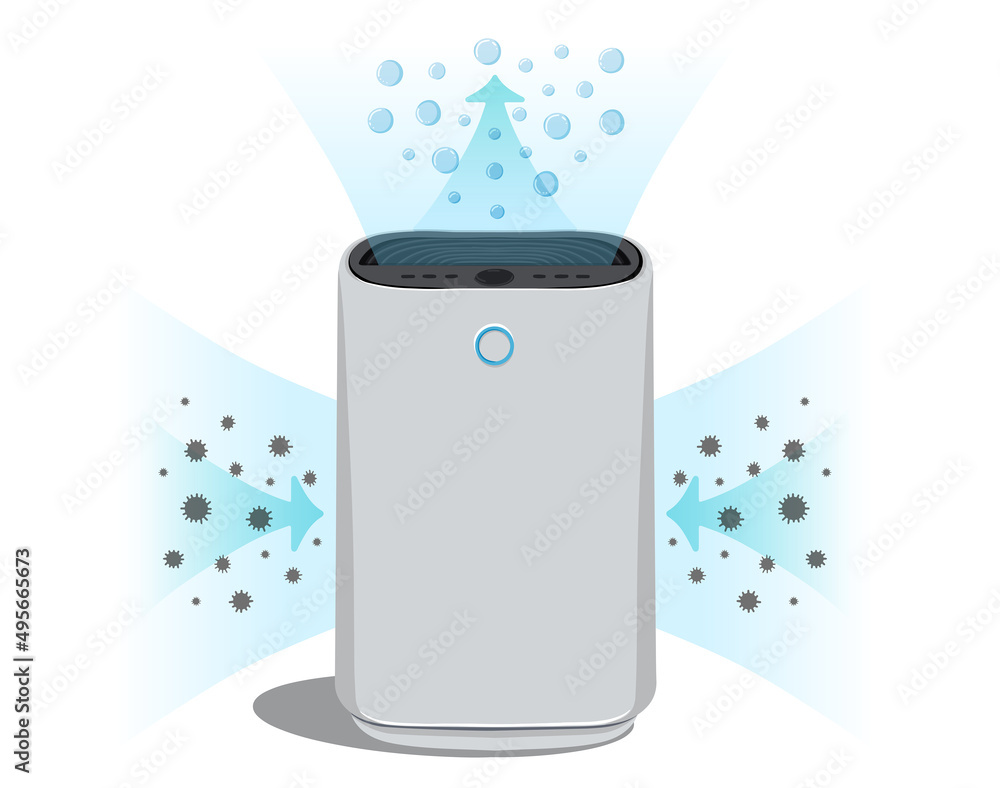 Flat vector air purifier isolated on a white background of the illustration icon. A device for cleaning and humidifying air for the home. Air purification process #495665673