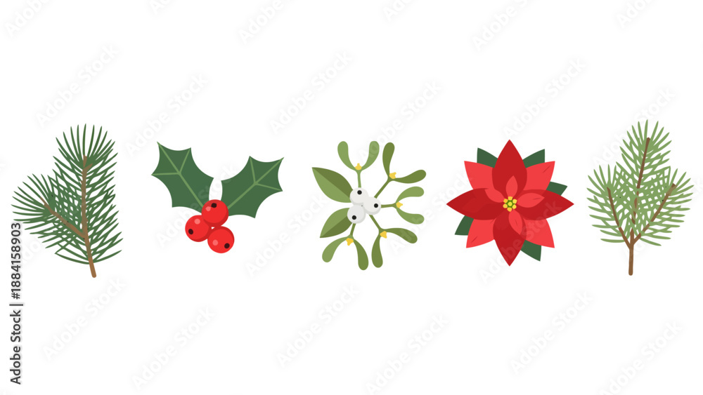 Flat vector Christmas plants pine holly mistletoe poinsettia illustrations set. #1884158903