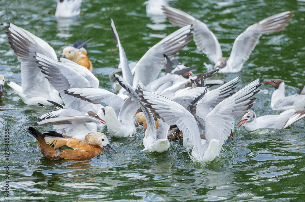 Flock of black-headed gull birds are feeding and floating in lake. Chroicocephalus ridibundus #1775435535