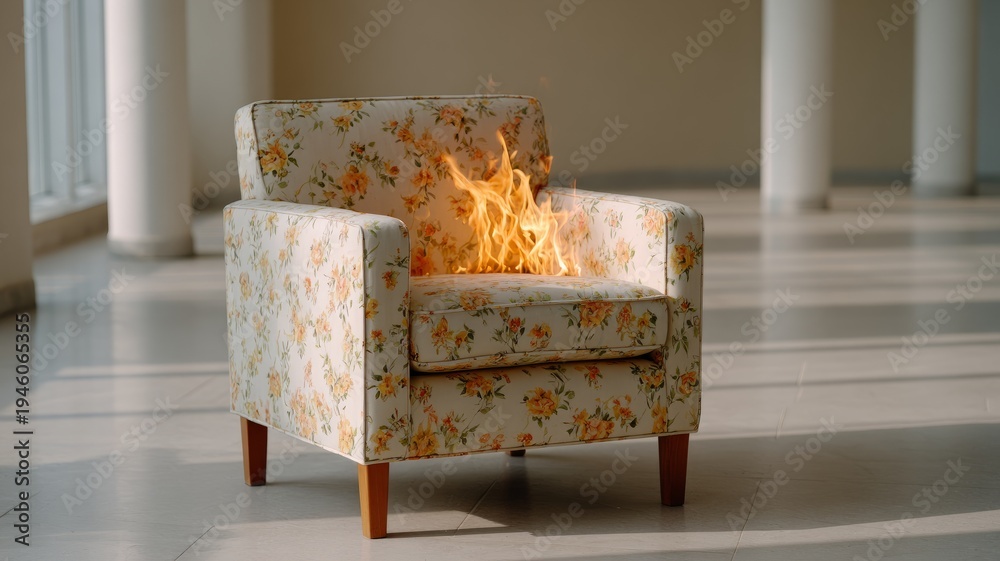 Floral Armchair on Fire in Bright Minimalist Room #1946065355