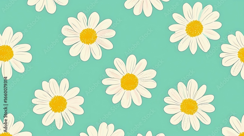 Floral Delight: A repeating pattern of charming daisies, showcasing simplicity and beauty. The bright yellow center contrasts with the delicate white petals on a refreshing blue-green background. #1660079314