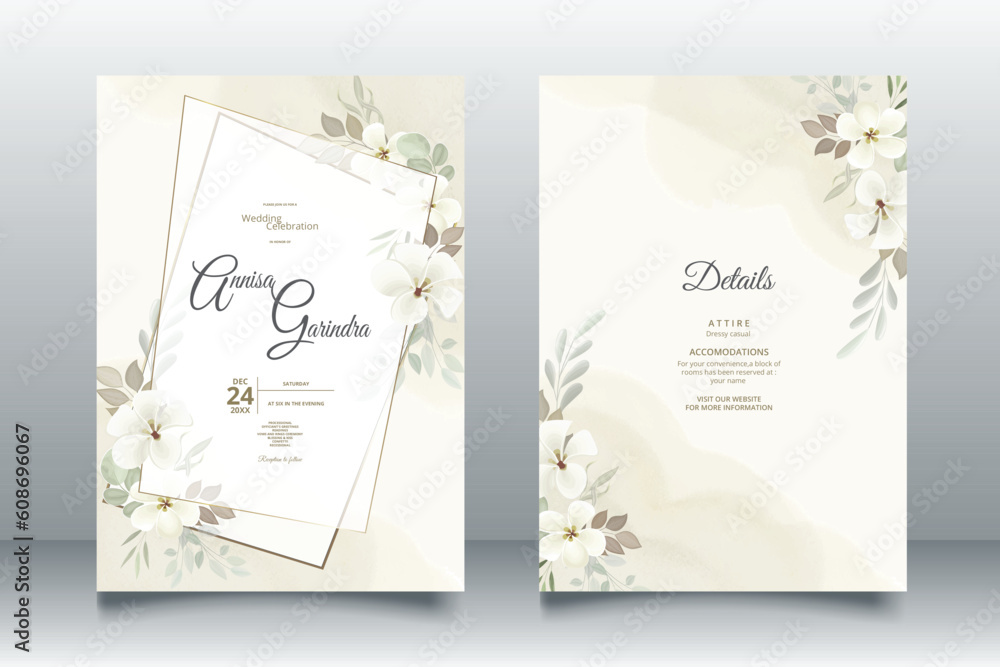 Floral wedding invitation template set with white flower and leaves decoration Premium Vector #608696067