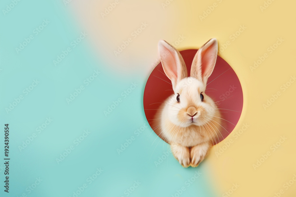 Fluffy Easter bunny peeps out of the blue and yellow wall. #1924390554
