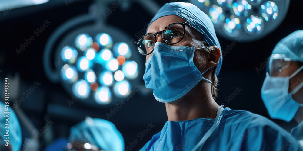 focused surgeon high tech operating room, wearing surgical attire and illuminated by bright #1391199999