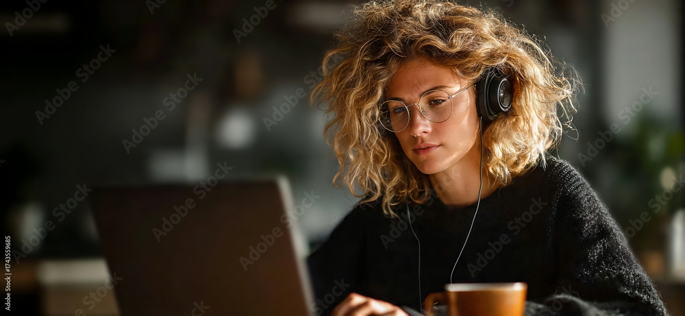 Focused woman with glasses and headphones immersed in work. she is engrossed in using laptop. This image captures the modern workplace, distance education, and the focus required for digital tasks. #1743559685