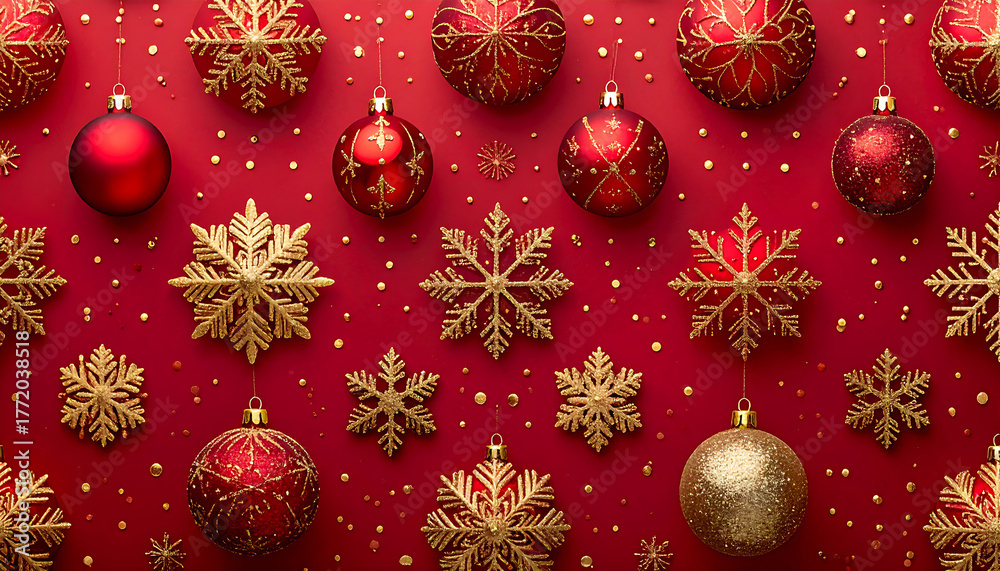 Fondo navideño rojo con esferas ornamentos dorados copos nieve brillantes decoración festiva elegante #1772038518