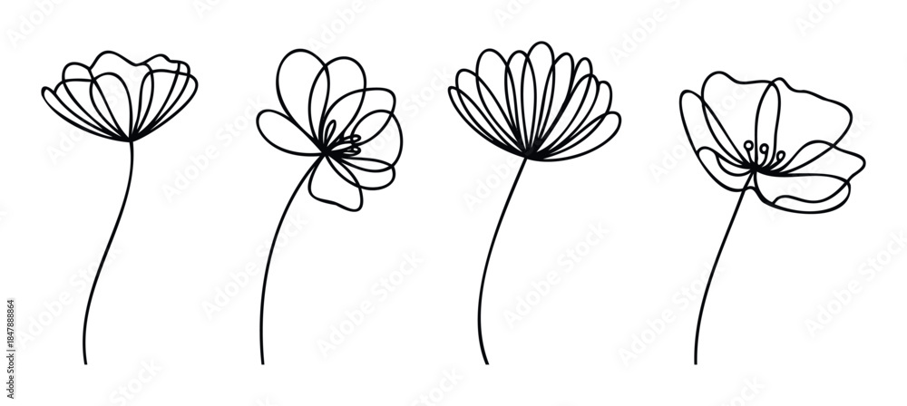 Four delicate floral outlines in black on white, perfect for feminine branding, wedding invitations, and natural cosmetic packaging. #1847888864