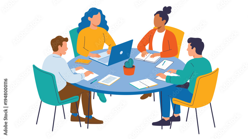 Four diverse individuals seated around a circular table with papers, notebooks, and a laptop, symbolizing teamwork, collaboration, planning, and professional or educational group discussion illustrat #1948000116