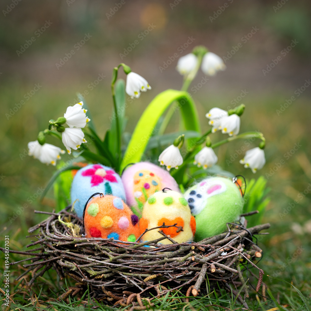 fresh flowers and easter eggs in a nest on the meadow #1945807031