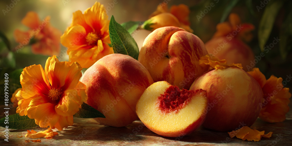 fresh peaches with marigolds in warm sunlight, sunlit still life of peaches and marigold blooms, natural summer scene with peaches and flowers #1809799809
