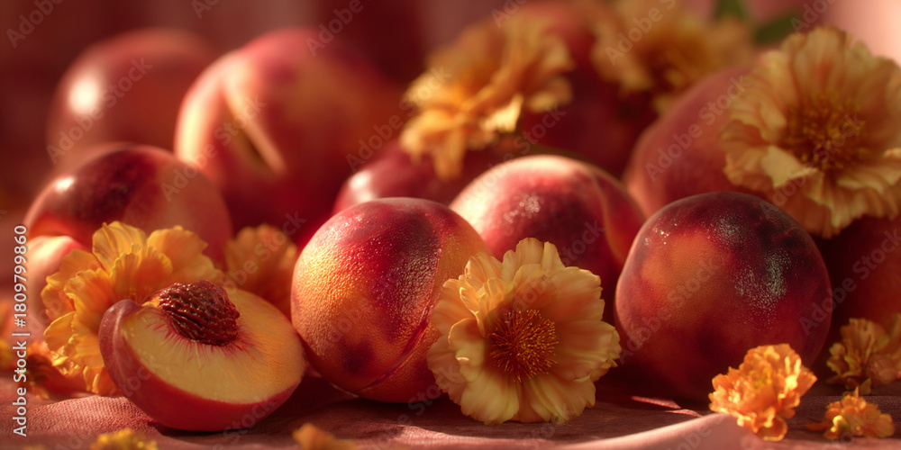 fresh peaches with marigolds in warm sunlight, sunlit still life of peaches and marigold blooms, natural summer scene with peaches and flowers #1809799860