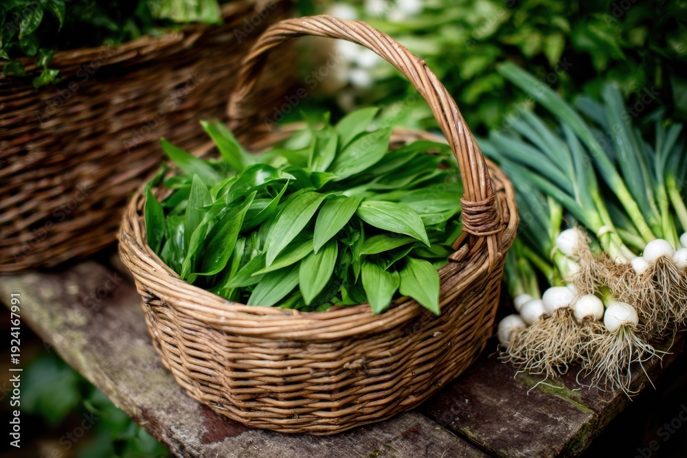 Fresh wild garlic and spring onions harvested in a basket #1924167991