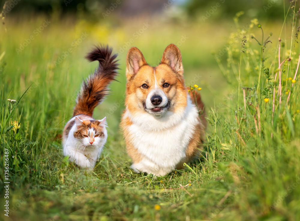friends cute kitten and corgi dog running through sunny meadow on green grass #1756216487