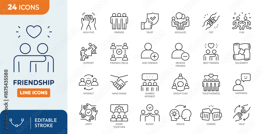 Friendshhip icon set. Contain icons related to friends, relationship, socialize, cheers, support, trust, and more. Editable stroke. Vector illustration #1875435580