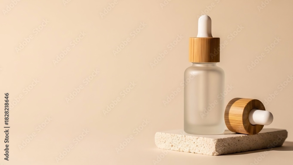 Frosted cosmetic dropper bottle and bamboo cap on a natural stone. #1828218646