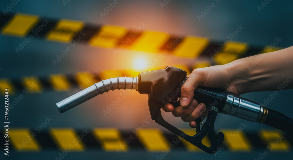 Fuel Crisis Concept with Hand Holding Gas Nozzle and Warning Tape Against Dark Background Symbolizing Energy Shortage #1950212443
