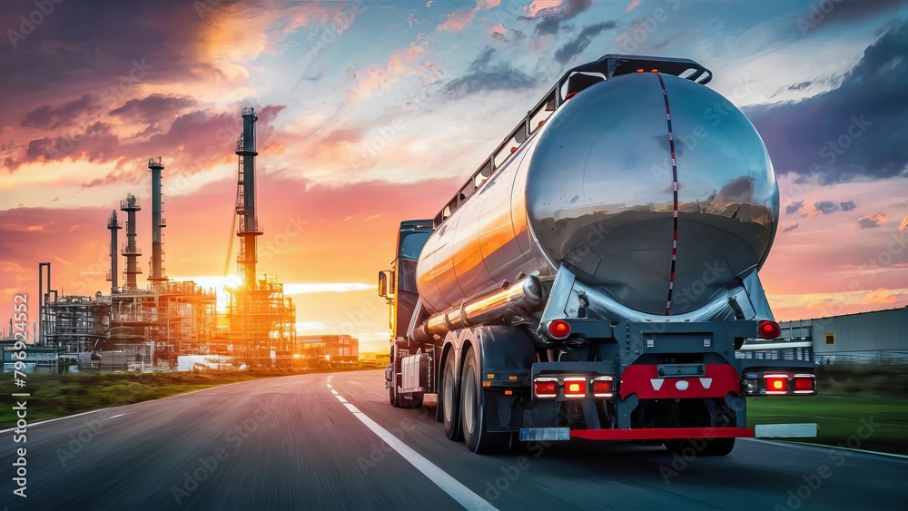 fuel tanker in motion, rear view. Transportation of fuel, delivery of fuel to an oil refinery, against the backdrop of sunset #796924552