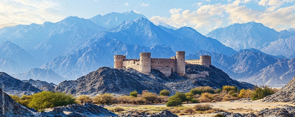 Fujairah Fort with the Hajar Mountains – A historic view of Fujairah Fort, one of the oldest forts in the UAE #997913382