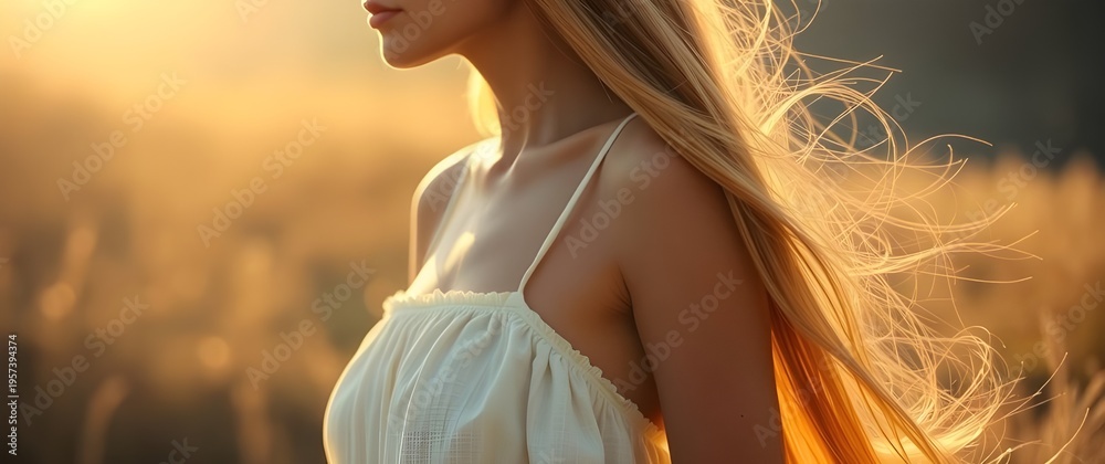 Full body cinematic shot, warm golden hour light, strong moody style, unusual fine art photography. Tall slender woman, pale skin, long flowing hair, white linen dress. Soft golden hour sunlight. #1957394374