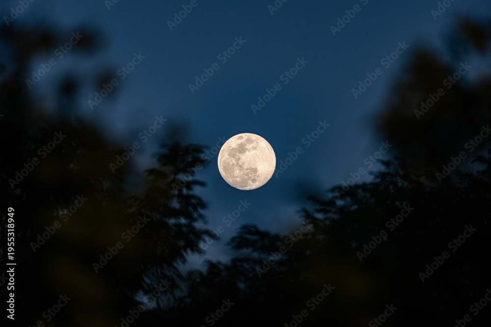 Full moon night sky bright moon nature dark tree silhouette evening twilight background peaceful serene mood circular lunar surface soft glow above forest #1955318949