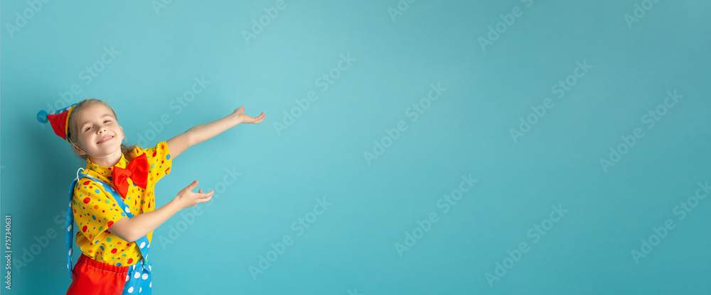 Funny kid clown against blue background. Birthday and 1 April Fool's day concept. Copy space #757340631