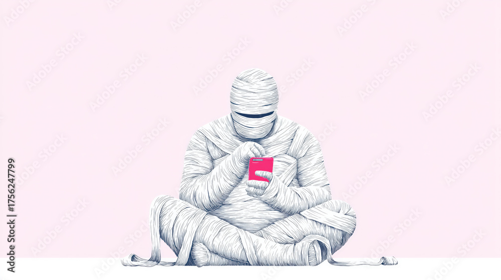 Funny mummy using smartphone on pastel background. Minimal modern illustration mixing Halloween and digital lifestyle with clean composition and humor #1756247799