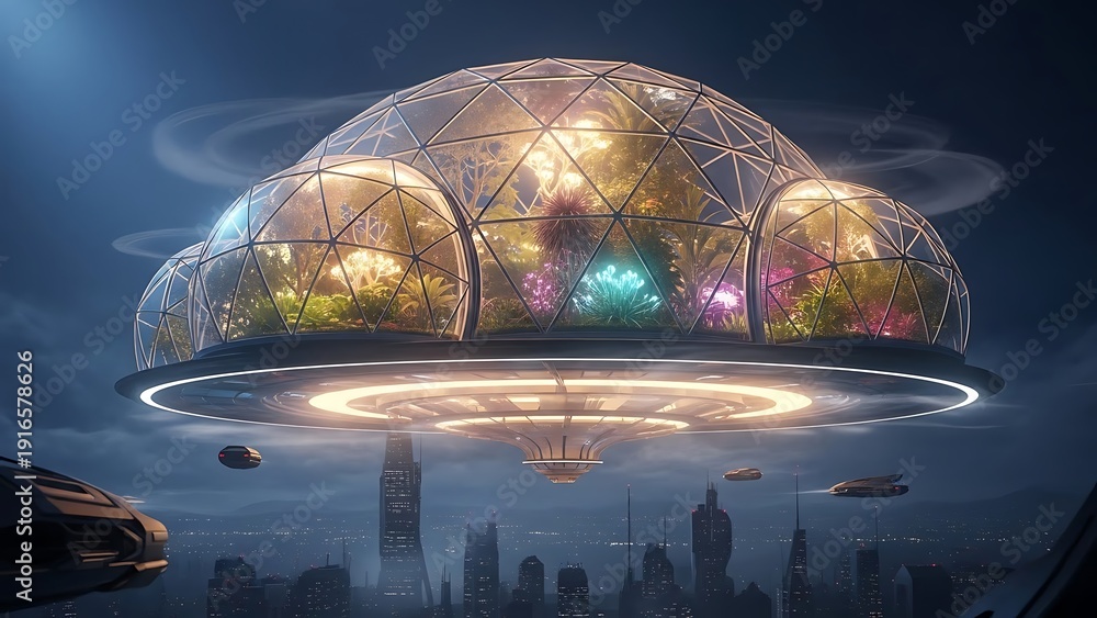 Futuristic Biodome Cityscape with Flying Vehicles. #1916578626