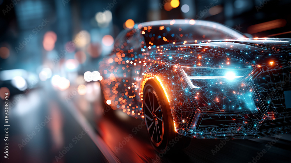 Futuristic car design illuminated with glowing dots, sleek modern aesthetic, defocused blurred dynamic setting, automotive technology art, with copy space #1870081754