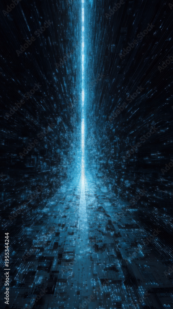 Futuristic city data tunnel with glowing light trails and fragmented streams at night #1955344244