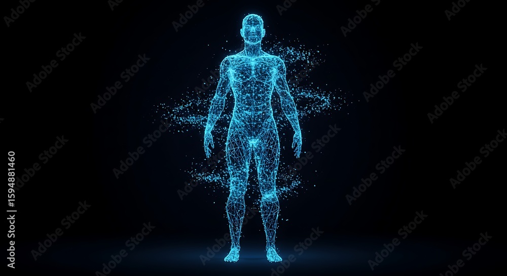 Futuristic concept of human anatomy as a digital avatar or AI, represented by a glowing blue particle plexus network. #1594881460